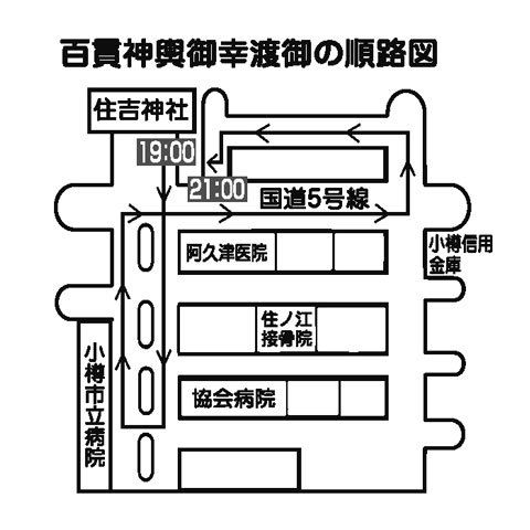 19:00神社出発〜19:30小樽協会病院〜20:00国道5号線〜20:30住ノ江会館〜21:00神社第一鳥居〜21:30神社宮入〜蔵入