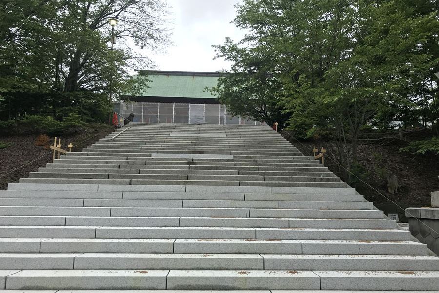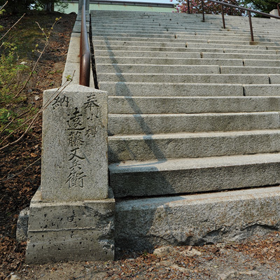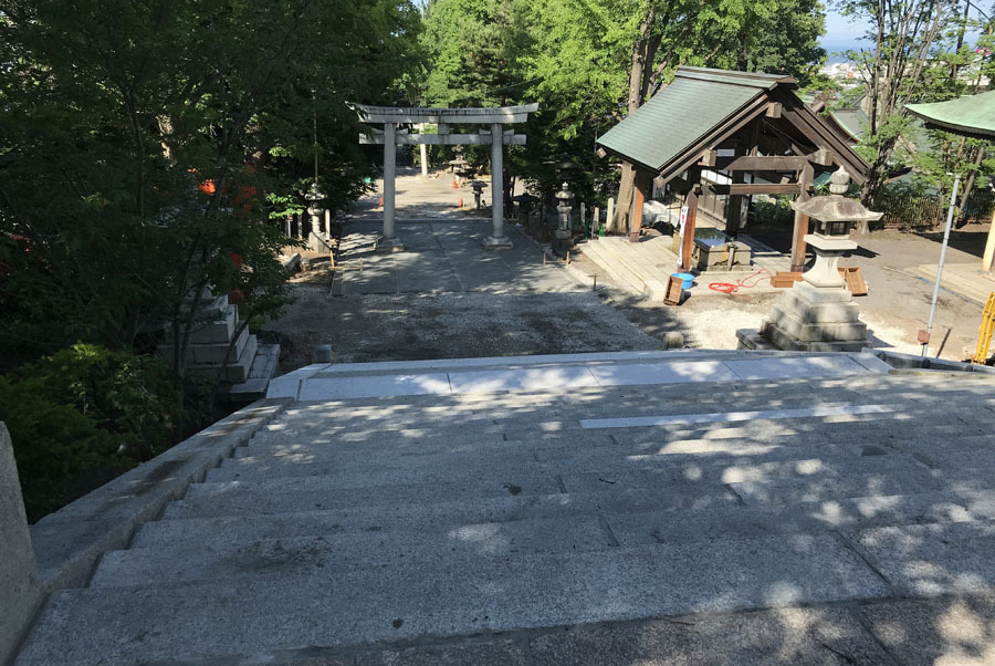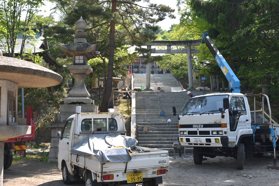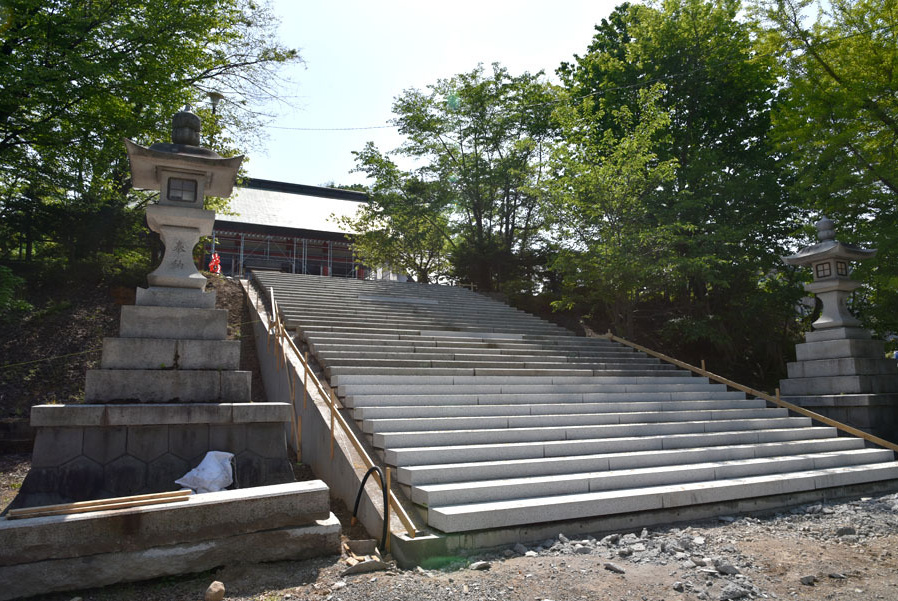 階段三箇所は明治三十年に現在地に遷座してより幾度かの改修を見て、昭和初期に現在の姿になりました。社殿近くの階段は海産物商として名高い遠藤又兵衛が奉納したものであり、国道沿いの参道入口から数えますと八十八の段があります。昔ながらの階段のため石段の上がり口が高く、高齢者の方々が苦労されなから参拝する姿を、多く見受けるようになりました。また、長年の風雪に耐えた階段ではありますが、繫ぎ目地がずれ、不測事態の発生が危惧されております。