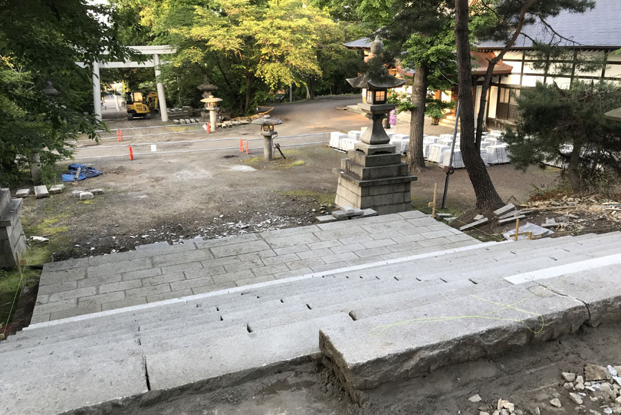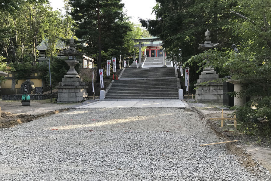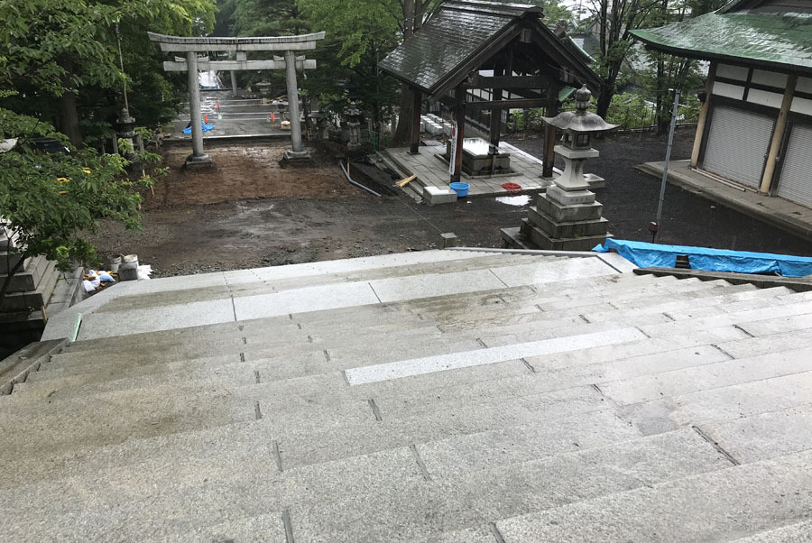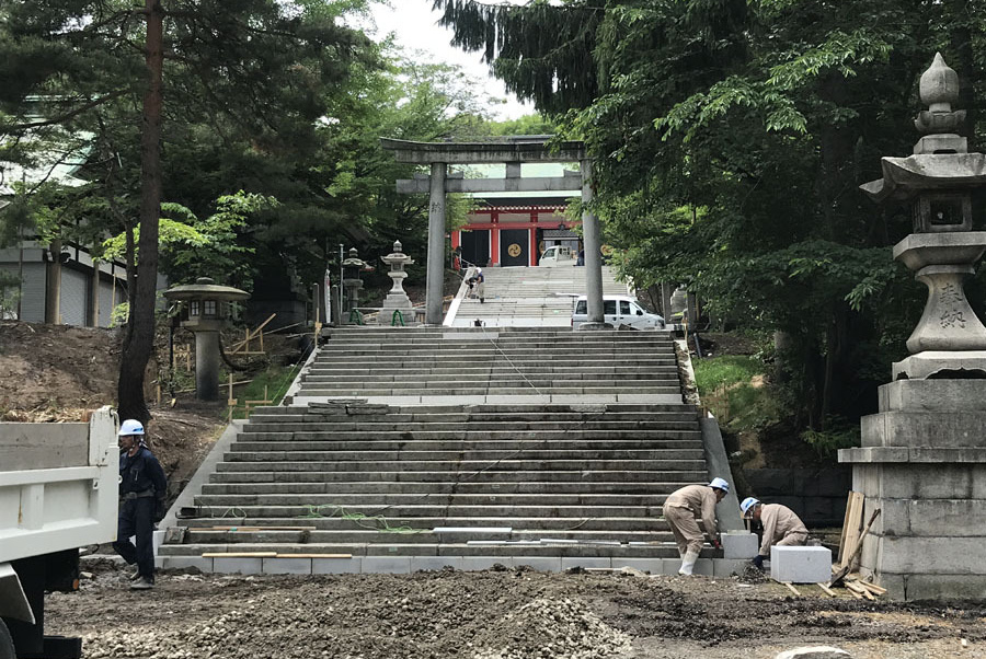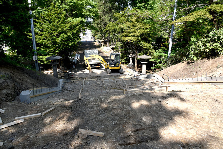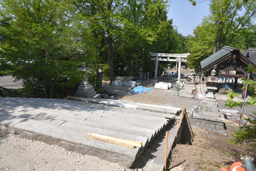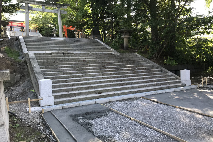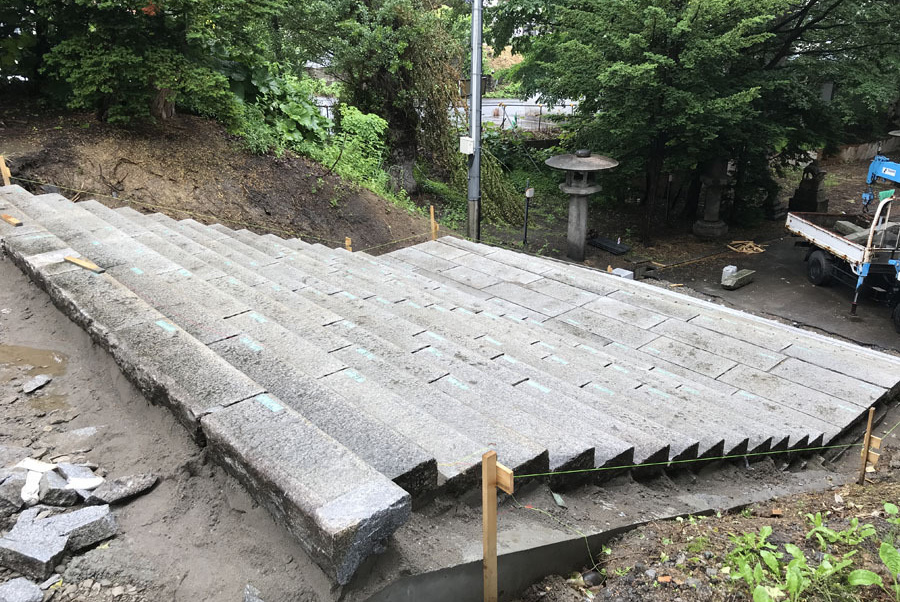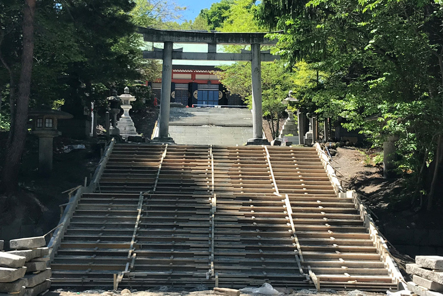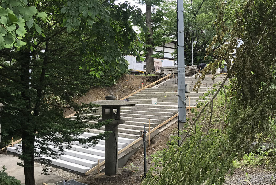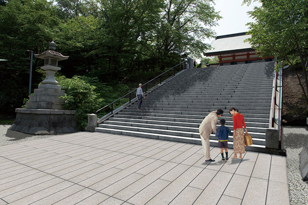 この度の改修工事では、参道三箇所の石段の基礎と積替えをすることにより勾配を緩やかにし、ご高齢の方々にも昇りやすい石段へ改修します。また冬期間も参拝しやすくするため、階段の一部をロードヒーティングします。