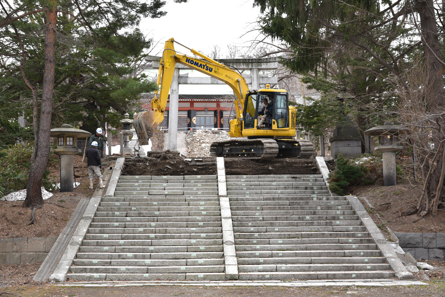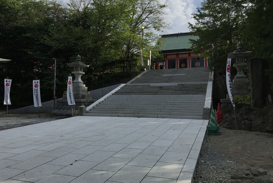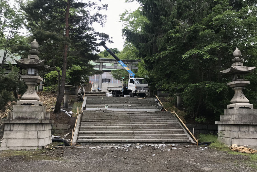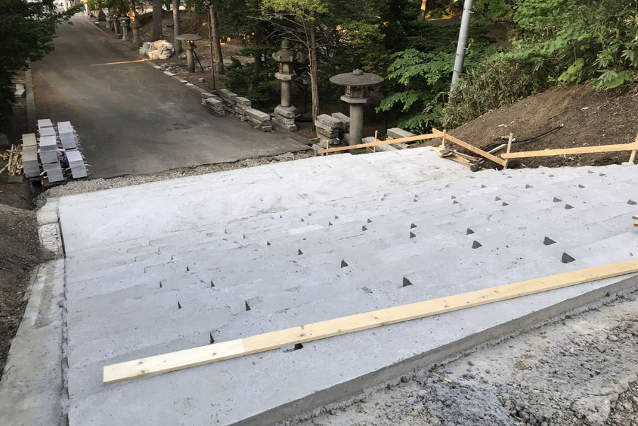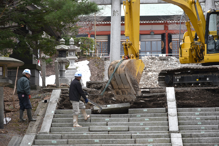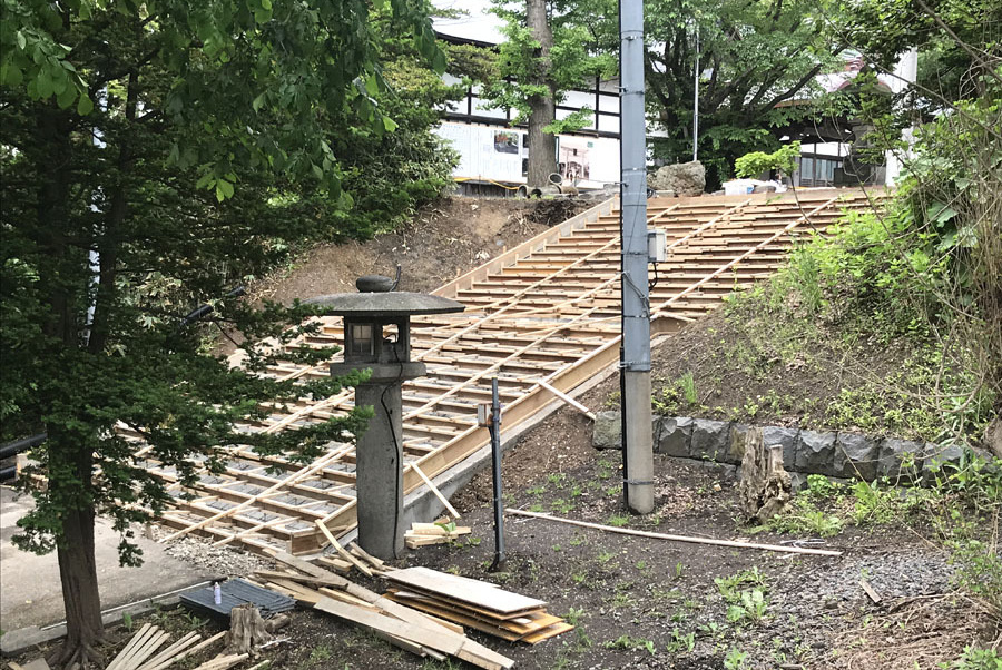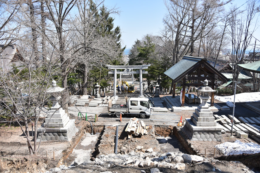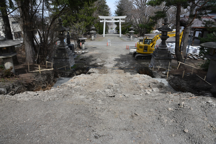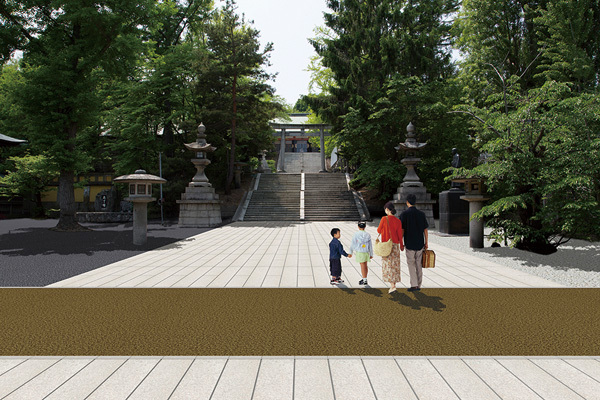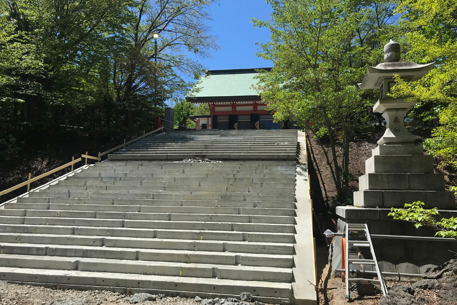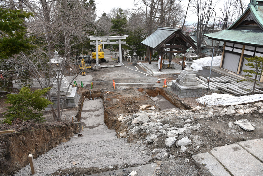 この度の改修工事では、参道三箇所の石段の基礎と積替えをすることにより勾配を緩やかにし、ご高齢の方々にも昇りやすい石段へ改修します。また冬期間も参拝しやすくするため、階段の一部をロードヒーティングします。