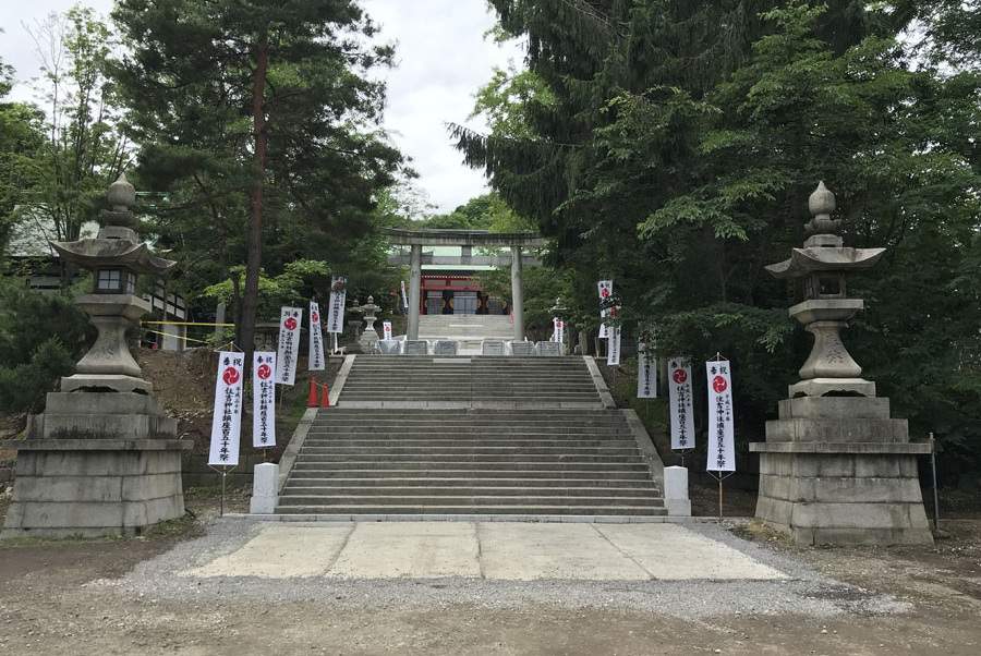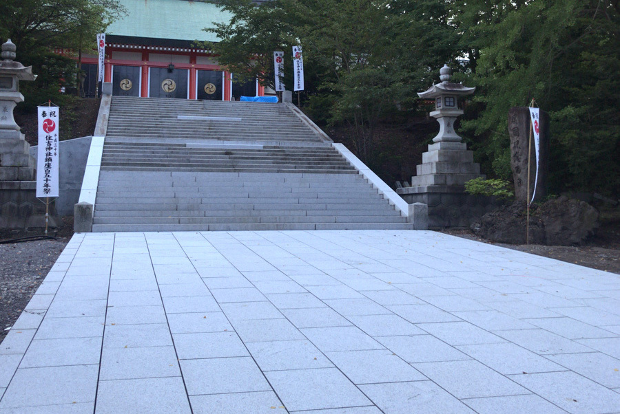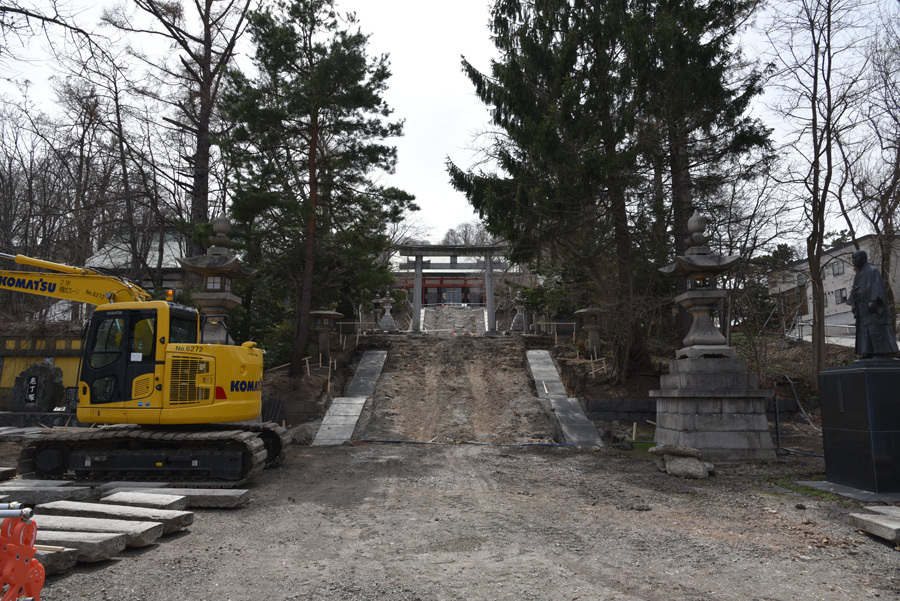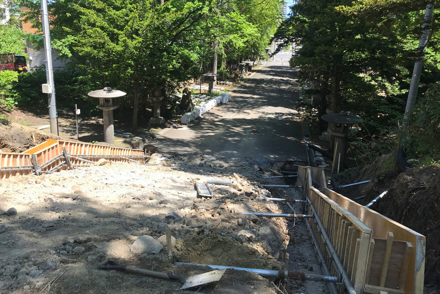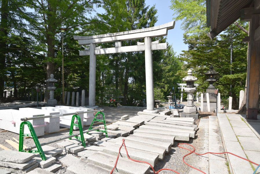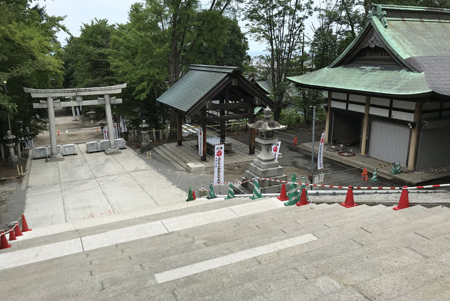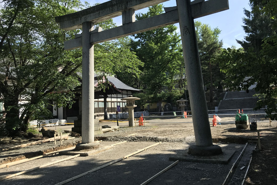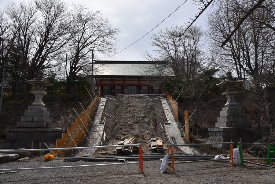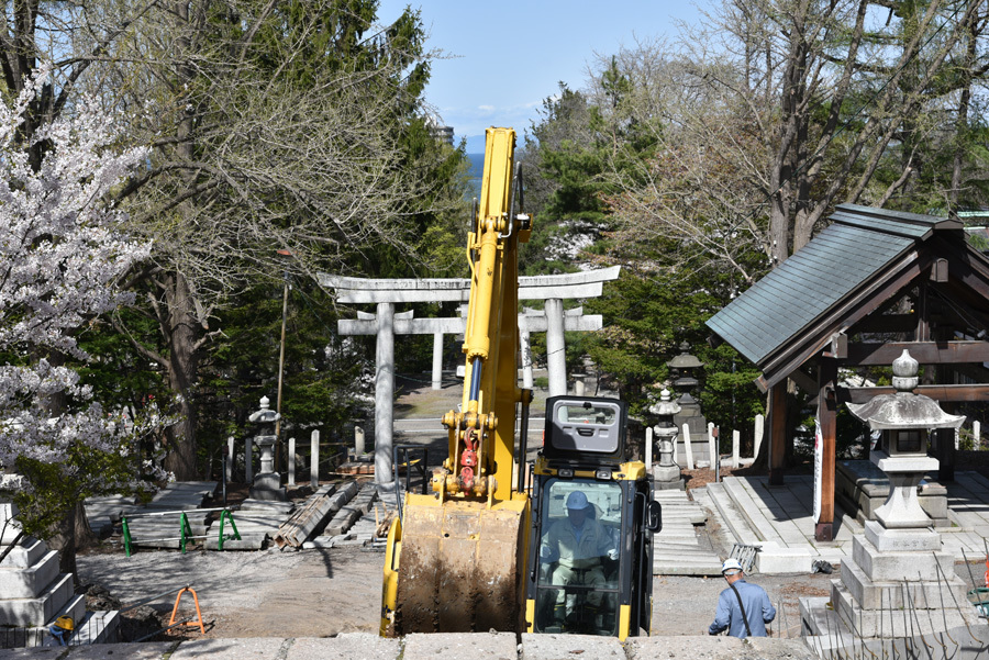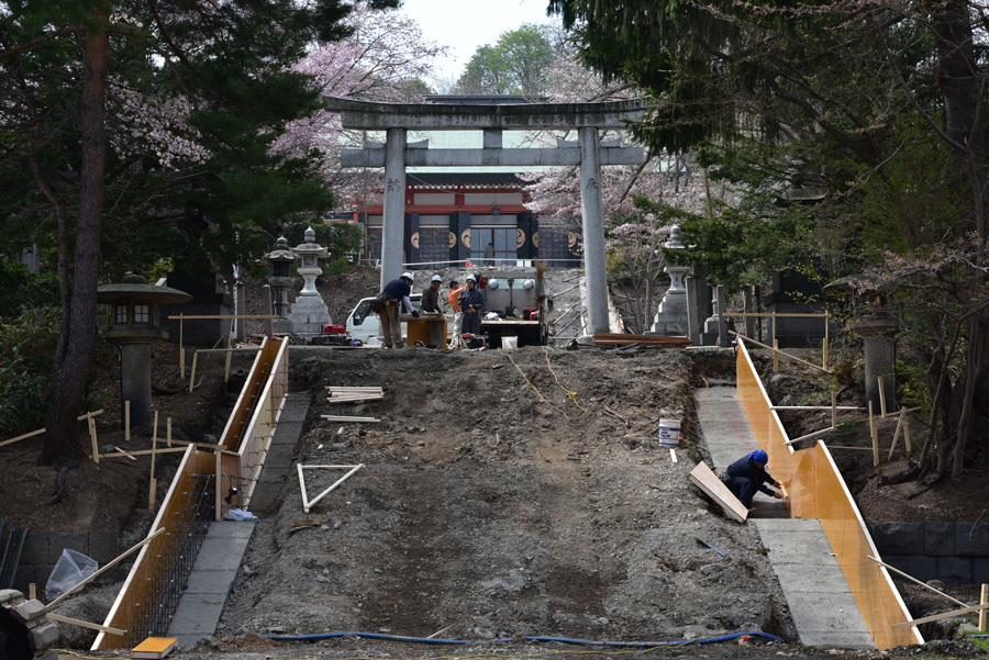 この度の改修工事では、参道三箇所の石段の基礎と積替えをすることにより勾配を緩やかにし、ご高齢の方々にも昇りやすい石段へ改修します。また冬期間も参拝しやすくするため、階段の一部をロードヒーティングします。